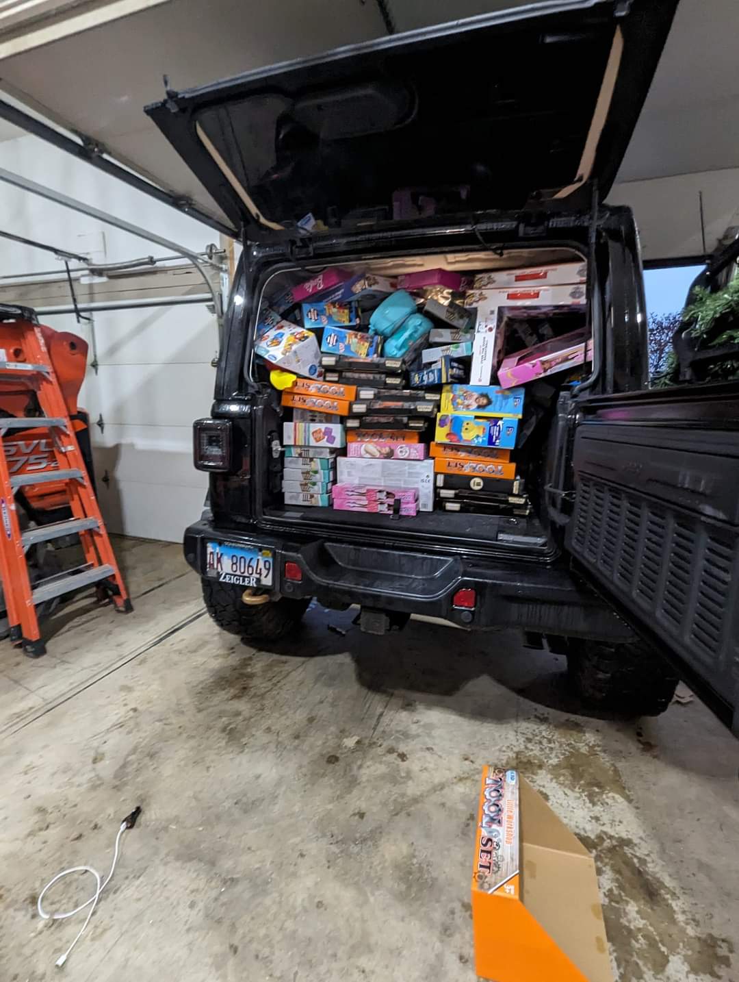 Last year, we were trying to avoid bringing the trailer because of parking and the weather(rainy). Night before we tried stuffing my jeep full and only got maybe 1/8 of toys we bought to fit. So then decided ok let’s fit the rest in the truck bed and backseat in boxes. Well that still wasn’t enough room. Frustrated, we decided to leave the rest behind what we couldn’t fit and headed on our way. Morning coffee and gas stop just a few miles from our house, we met with another jeeper in the area and asked if she wouldn’t mind going back to our house and filling up her jeep whatever more we could fit, so we did exactly that.